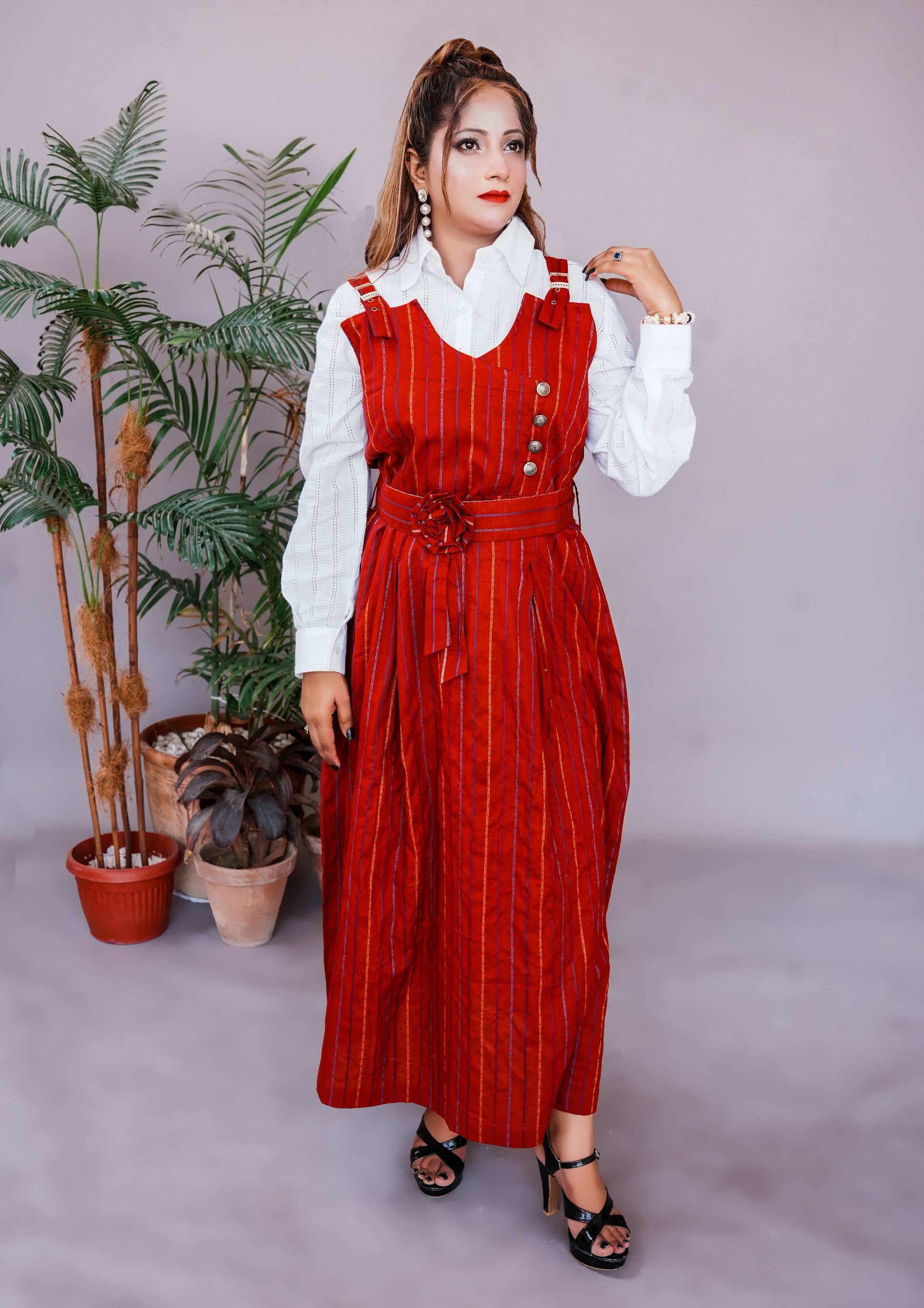 This fashion-forward set features a sleeveless pinstriped romper paired with a classic white inner shirt. Designed for effortless grace, the structured waist belt with a floral accent adds a feminine touch, while the lightweight cotton ensures all-day comfort. Whether you’re heading to a brunch, a meeting, or an event, this look delivers both sophistication and ease.
