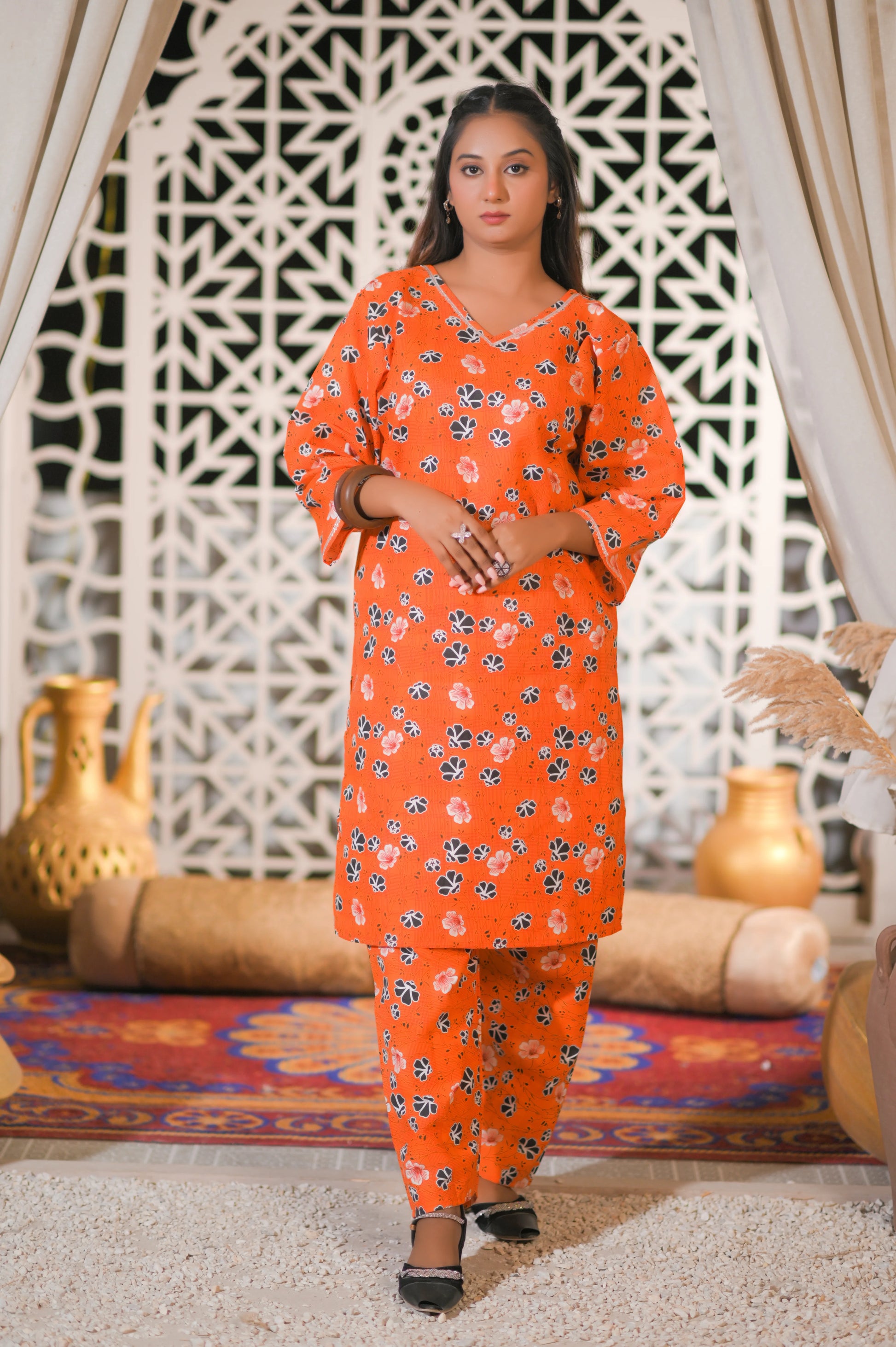 Orange Floral 2-Piece Cotton Suit.
